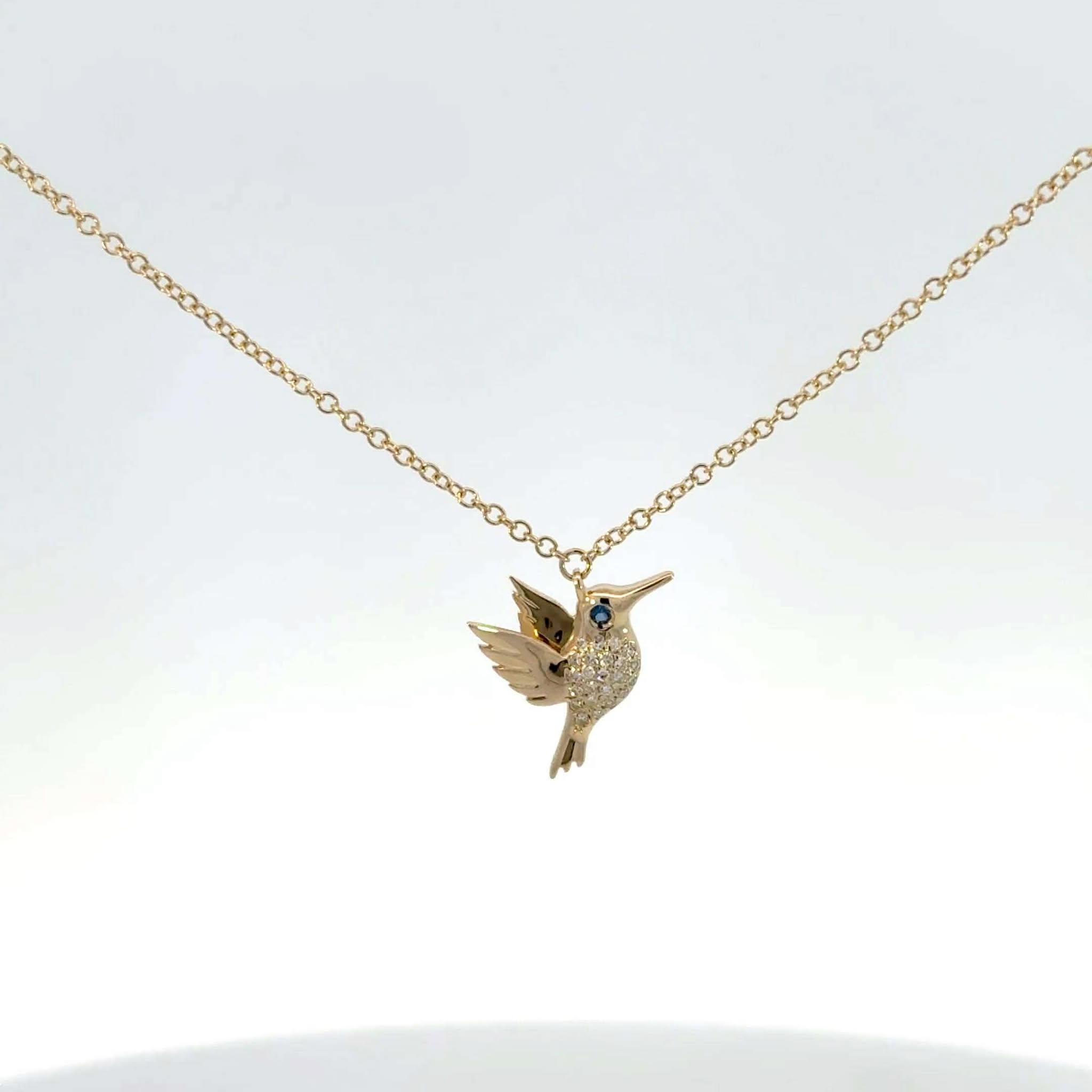 Lady’s Yellow Gold Necklace with Hummingbird Pendant with Diamonds and a Sapphire